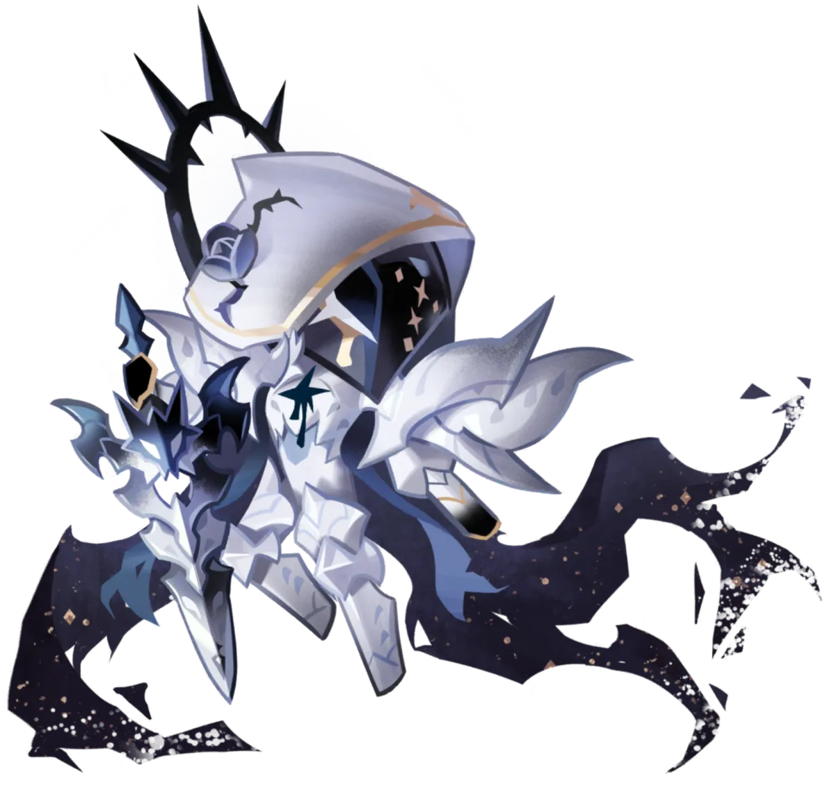 | 온 반죽을 검은 갑옷으로 감싼 이 쿠키는, 악마의 이름을 갖기 전에는 다른 신의 대리자들과는 달리 군림하거나 통치하지 않았다고 전해진다. 그저 기사단장으로서 같은 뜻을 맹세한 이들을 이끌며 메마른 땅에 연대의 가치를 전파했다고. 그러나 홀로 감내하기엔 신에게 받은 사명이 너무나도 가혹했던 탓이었을까? 다른 누구보다도 자기 자신에게 가장 엄격했던 그 역시 결국 타락의 속삭임을 피할 순 없었다. 함께 살아가던 모든 쿠키의 생명을 앗아가는 재앙을 일으킨 뒤, 결국 신의 마법으로 봉인되었기에. 악마가 봉인된 뒤에도 그에게 죽음을 맞이한 이들은 원혼이 되어 지상을 떠돌며 살아있는 쿠키들은 발을 들이지 않게 되었으니... 언젠가부터 메마른 땅은 침묵의 땅이라고 불리게 되었다고. 긴 세월이 지나 모든 악마가 눈을 뜨고 새로운 반죽을 얻은 지금. 침묵의 땅, 소금 결정처럼 떠오른 새하얀 달 아래 사일런트솔트 쿠키가 돌아왔다. 아주 먼 옛날 악마로서 이 땅에 검을 휘두른 뒤 찾아왔던 정적과 함께. | |||||
